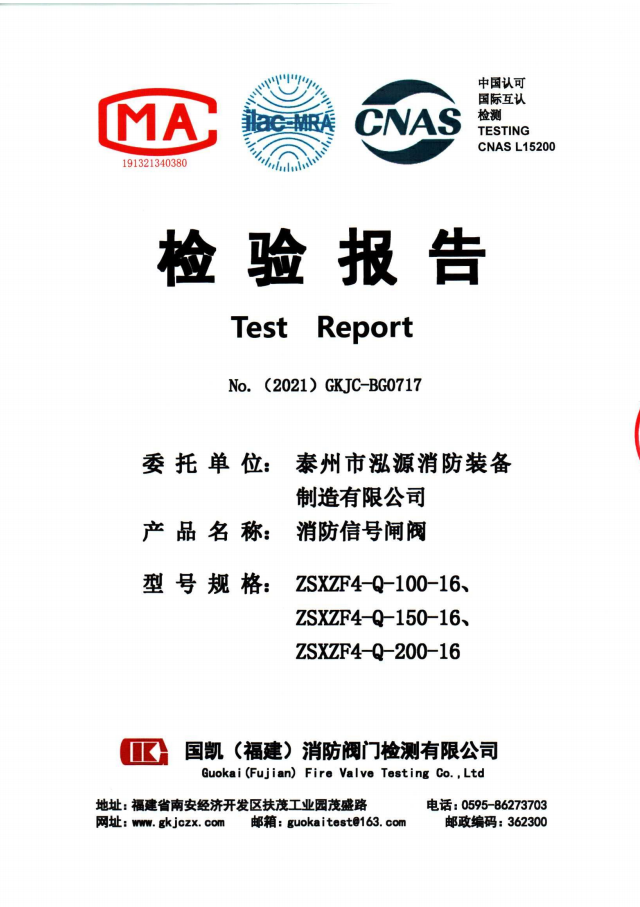 啟真法蘭消防信號閘閥ZSXZF4-Q檢驗報告