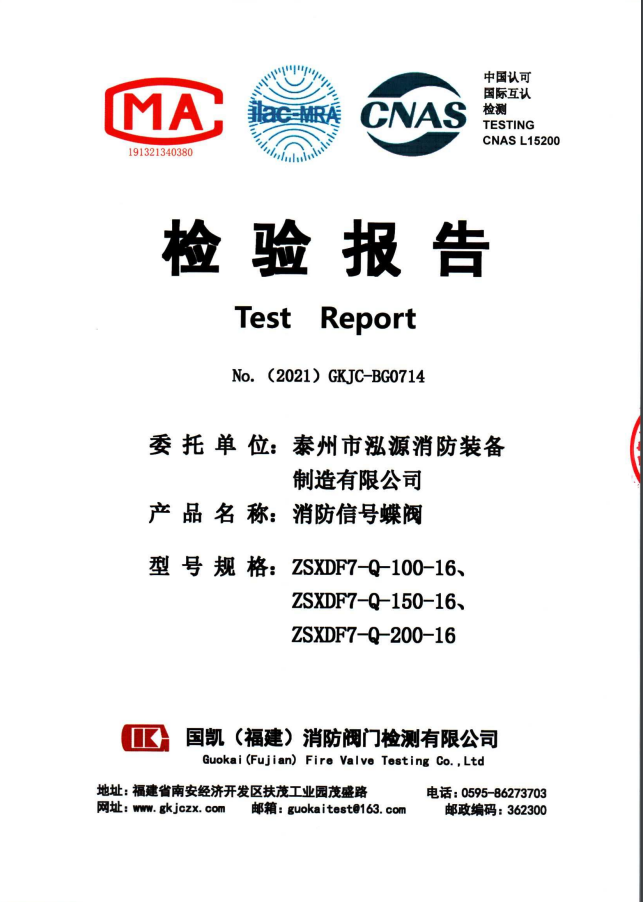 啟真對夾消防信號蝶閥ZSXDF7-Q檢驗報告